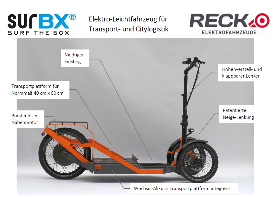 Durch eine patentierte, neuartige Konstruktion bietet SurBX ein völlig neues Fahrgefühl - gleiten Sie wie ein Surfer durch die Landschaft - legen Sie sich wie auf Skiern in die Kurve. Der einfache Aufbau und die soliden, hochwertigen Komponenten machen SurBX zum zuverlässigen Begleiter für Privatpersonen, Gewerbetreibende, Lieferservice, Logistiker und vieles mehr!